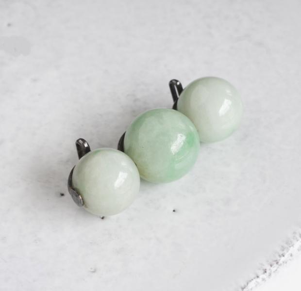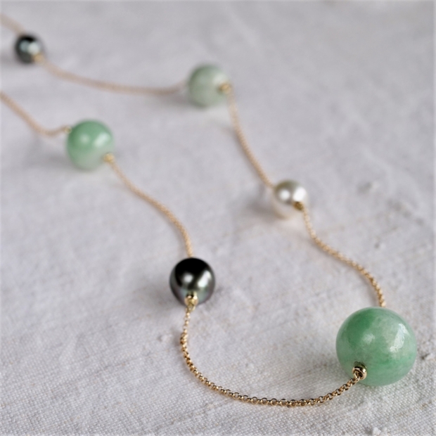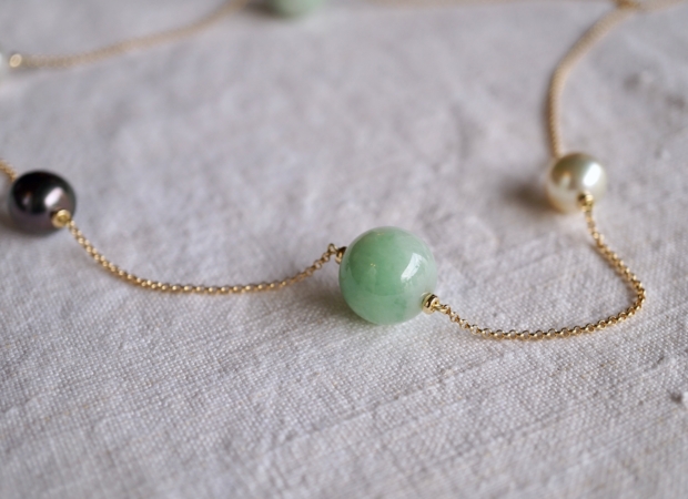 帯留の翡翠をつかってロングネックレスにお仕立てしました。 翡翠とマッチするパール、ブラックパールをご用意。 ゴールドチェーンに通して、シンプルで印象的なアイテムに仕上がりました。 [K18/翡翠/パール]