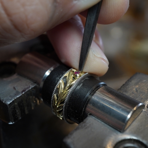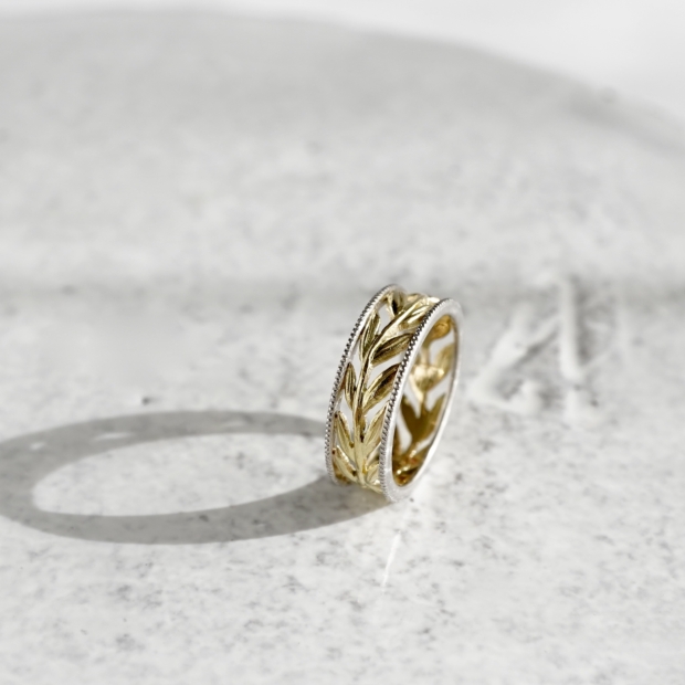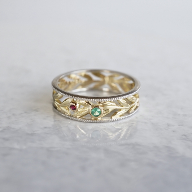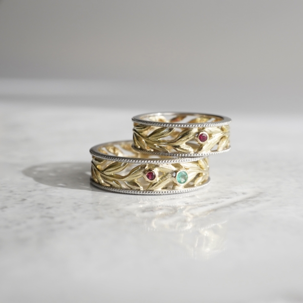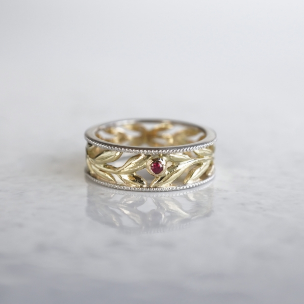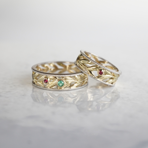 ご夫婦の思い出のストーンを使ってペアリングをお作りしました。 植物の枝葉をモチーフにした透かしのデザインです。 ゴールドとプラチナのコンビに、ストーンの色味が加わり華やかな仕上がりとなりました。 [K18YG / Pt900 / エメラルド・ルビー(お持込み)]