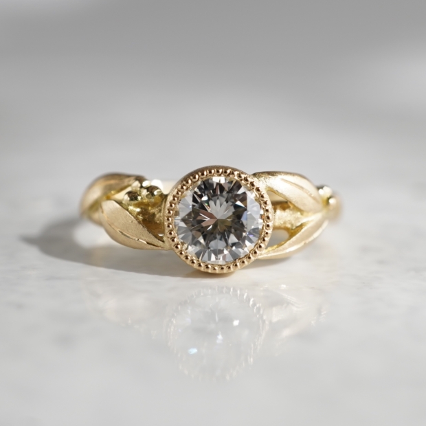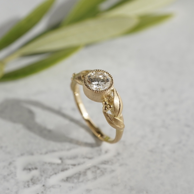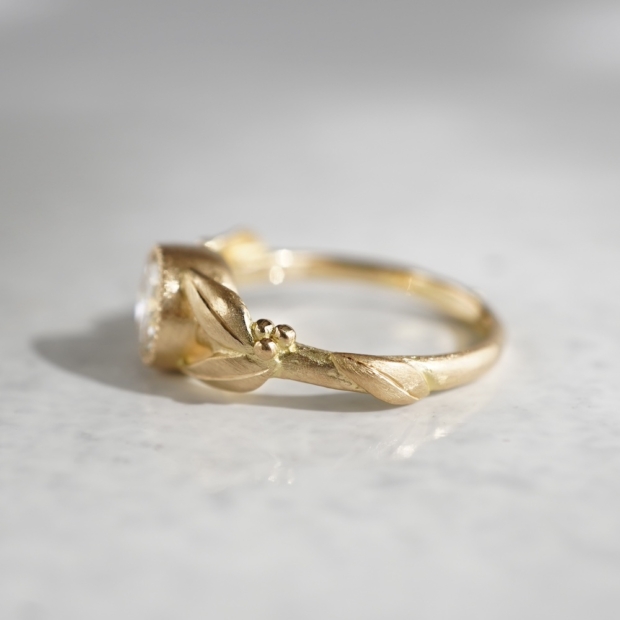 直径6.3mmのボリュームあるダイヤモンドが自然になじむよう、石枠のまわりに葉をあしらったデザイン。