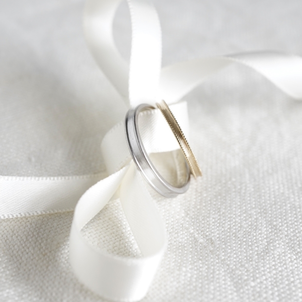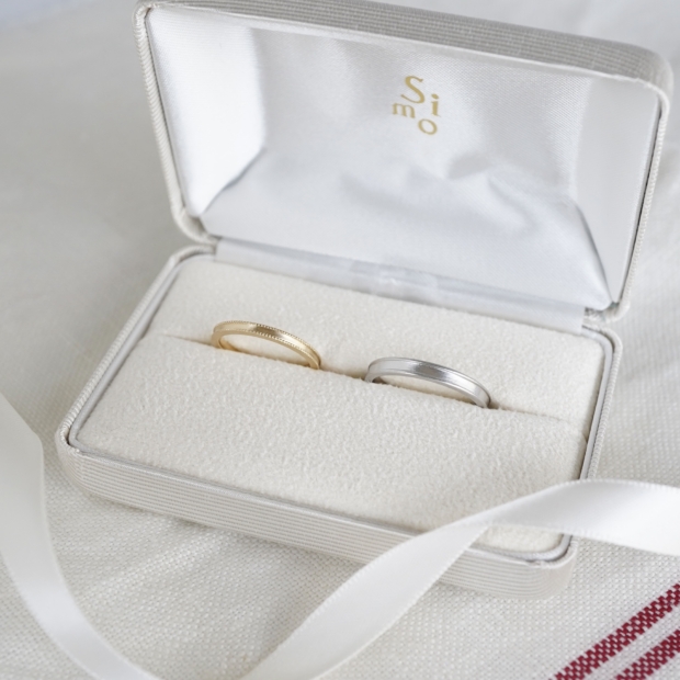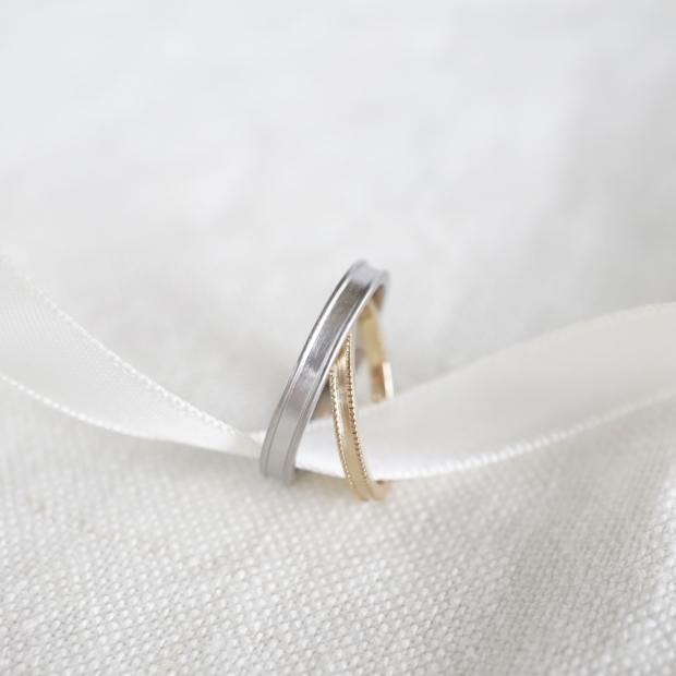 コレクションより[Double milgrain ring]のデザインを基本に、レディースリングは幅を広めにカスタム。