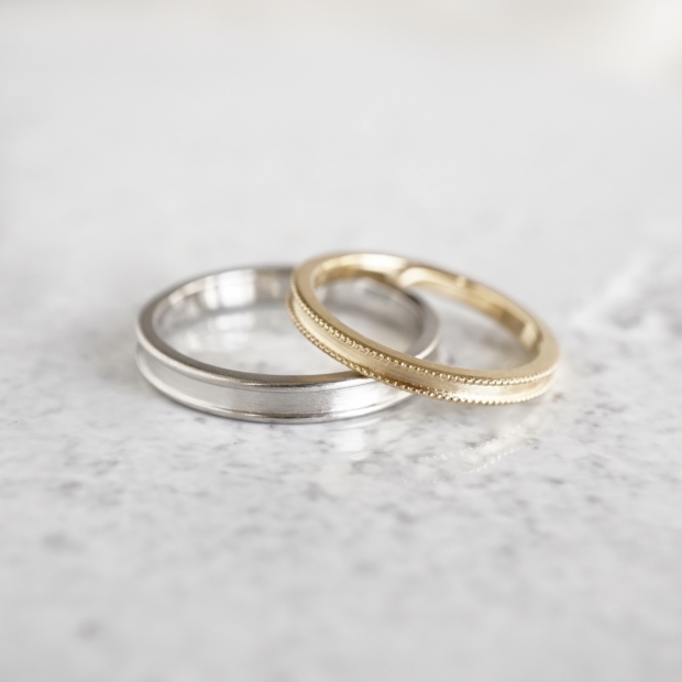 メンズリングは、幅を広めでミルグレインの装飾をなくし落ち着いたデザインに。